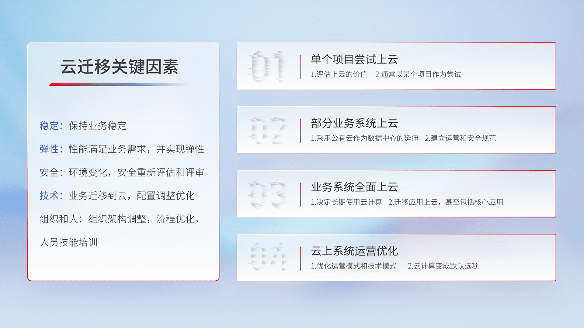 结合实际业务,,,从规划设计、、、、云平台选型、、、云原生改造、、数据迁移、、、集成交付,,,,迁移全过程为客户识别最佳上云路径,,做好风险识别管理,,设计网络架构、、、、身份权限、、、、安全审计合规、、、操作审计、、日志审计、、监控告警策略、、多站点容灾设计等,,,,对云上基础设施进行整体规划,,,提升IT治理水平,,,,以满足弹性、、、高可用、、、、高性能的需求。。。
