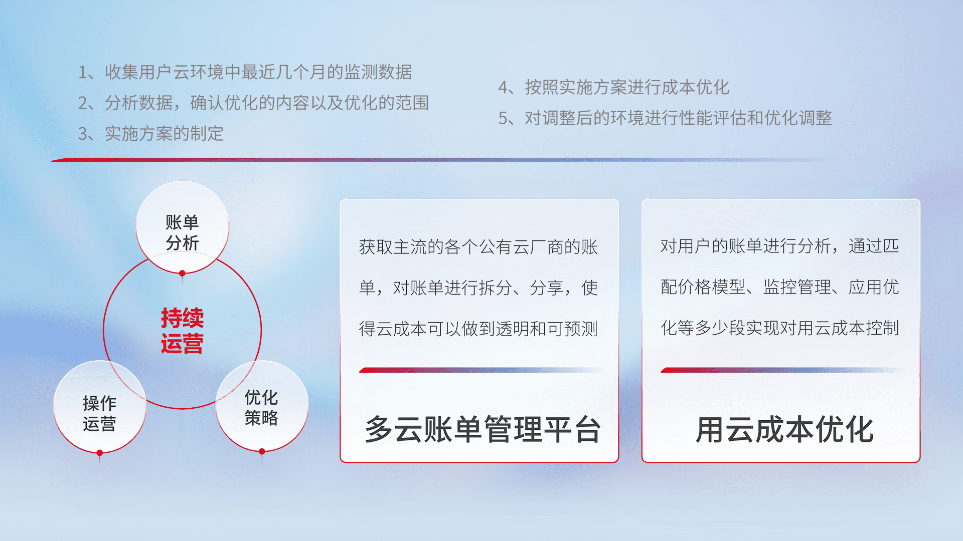 通过多云纳管,,以统一的资源数据模型把客户的云资源进行抽象和封装,,进而实现对多云资源的统一操作,,,保障云资源管理的可靠性、、稳定性与可用性。。量身定制化运维内容,,,,配置、、、、开发运维、、补丁管理、、、、备份、、、、监控、、认证和访问管理、、审计和日常巡检等,,保障在用云过程中的可靠度,,,,稳定度以及高可用率。。