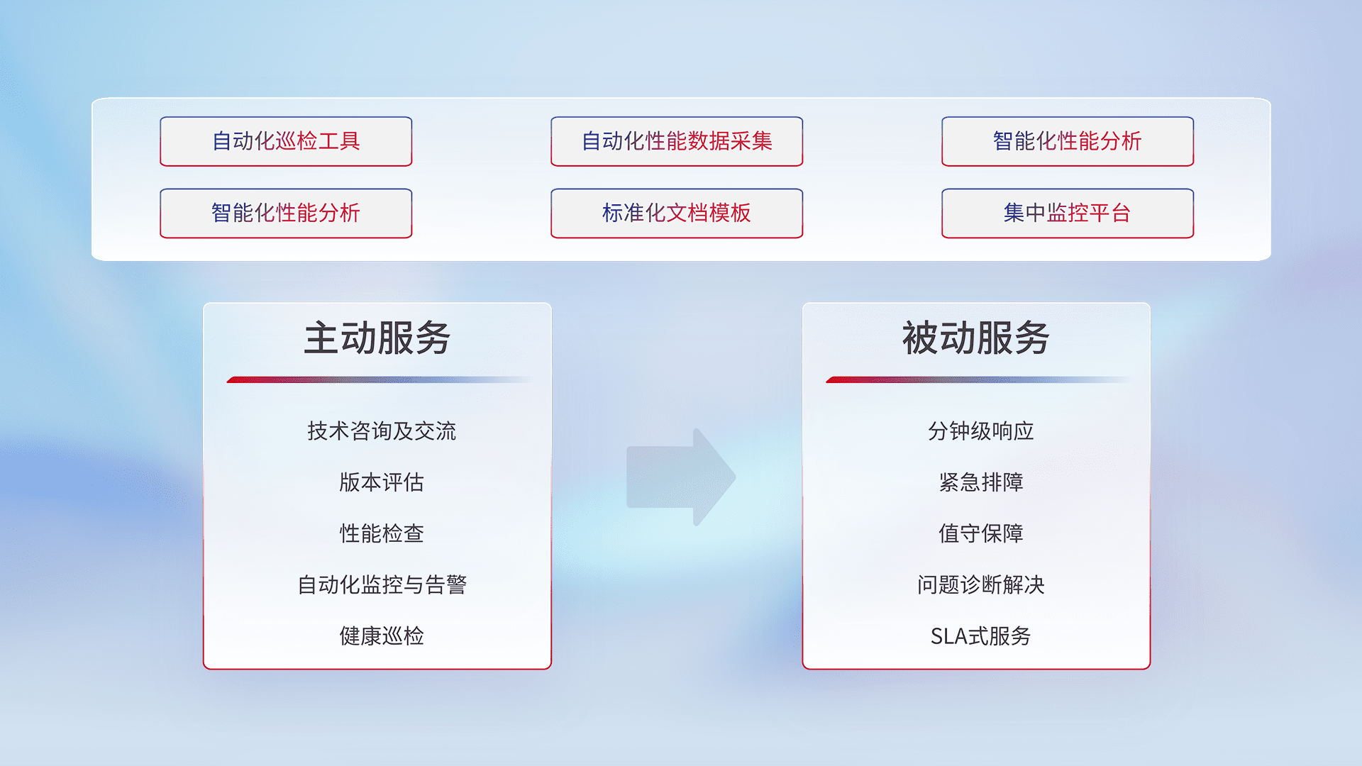 智能化工具和标准化文档,,,,保障服务质量,,,提供主动服务(包含技术咨询、、、版本评估、、、、性能检查、、自动化监控与告警、、健康巡检)和被动服务包含(分钟级响应、、、紧急排障、、、、值守保障、、问题诊断解决、、SLA服务)。。